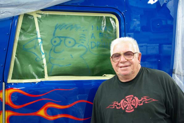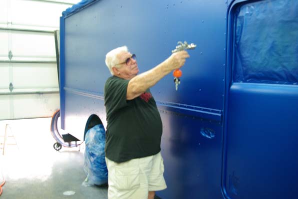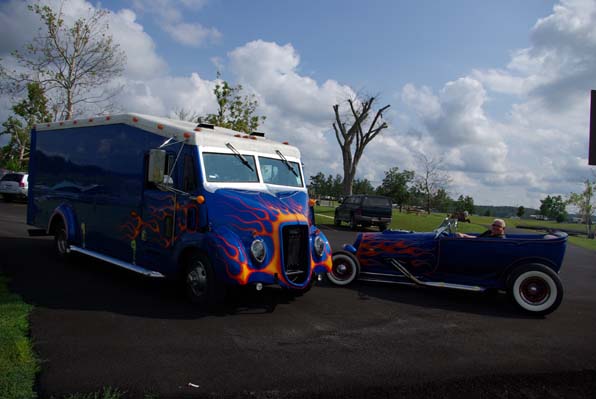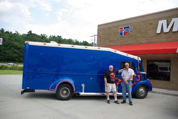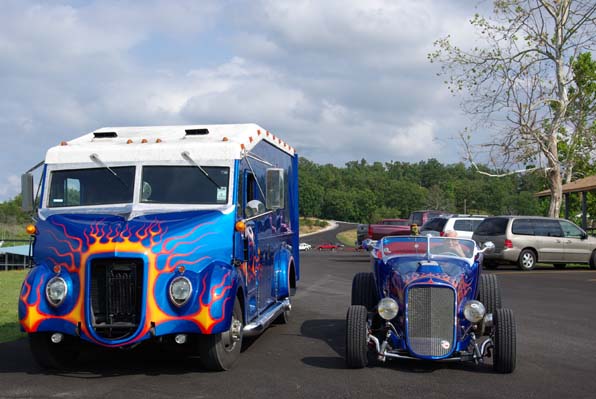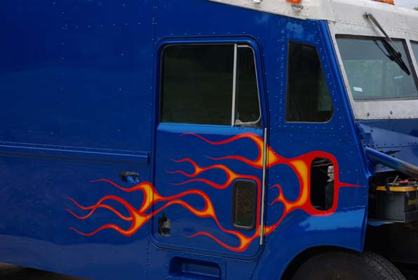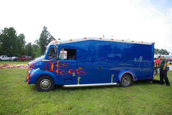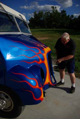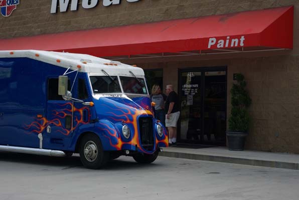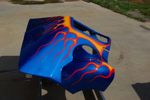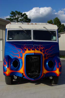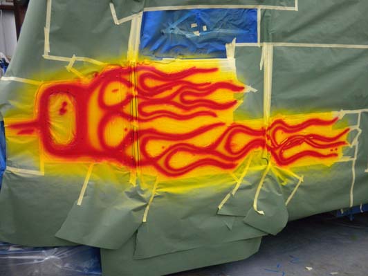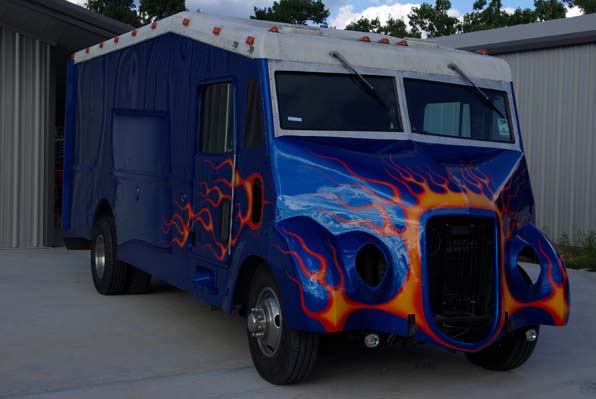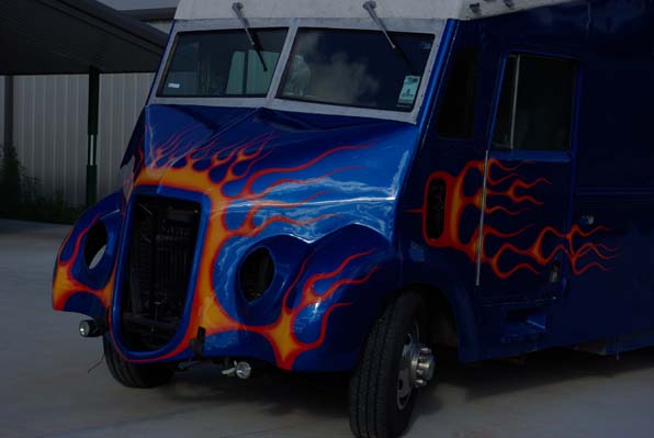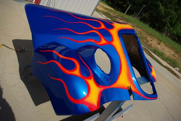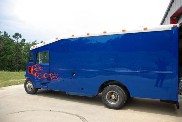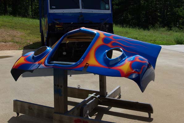 In time for the NSRA Springfield event the Monster was back on the road (temporary turn downs instead of the side exhaust). The first dive for Norm was with a full load. The hills between Lead Hill and Springfield were no problem for the new engine. Mileage improved too. Not a bad conclusion for an engine swap. During the event in Springfield Norm was so happy with the way the hauler now hauled that he had another idea. "Hey, you guys did a great job with the engine, do you think you could paint it?" Razorback Rides has a new booth but the Kookie Monster is more than just a little too big to fit. Two 100 rolls of masking film covered most of the things in their fab building while the Monster received a new paint job. Norm did not want to go overboard so he requested a basic flat black paint scheme. Razorback Rides said the difference in work between a flat black job and pearl blue with red and yellow flames was not great enough to justify the monochrome approach. Norm said keep it simple till the day he saw it painted. Norm was quick to say, " I knew blue with flames would look fantastic". Razorback Rides offered to spray a quick coat of flat black over the vehicle if that was really what Norm wanted. To be polite Norm said "No, thats OK."