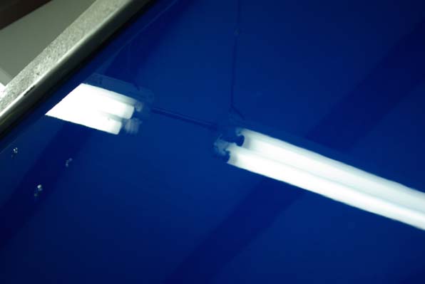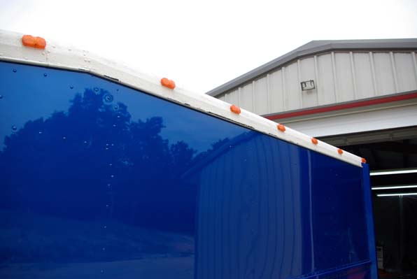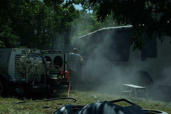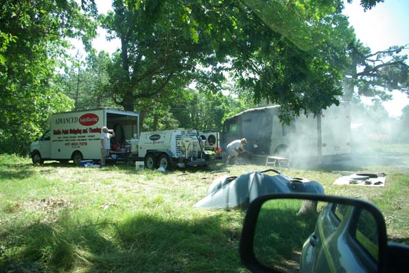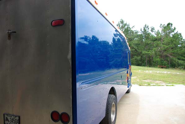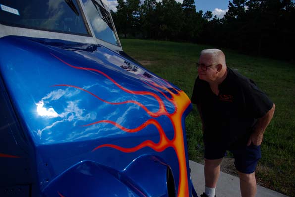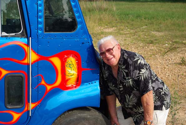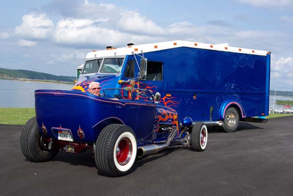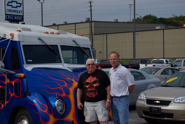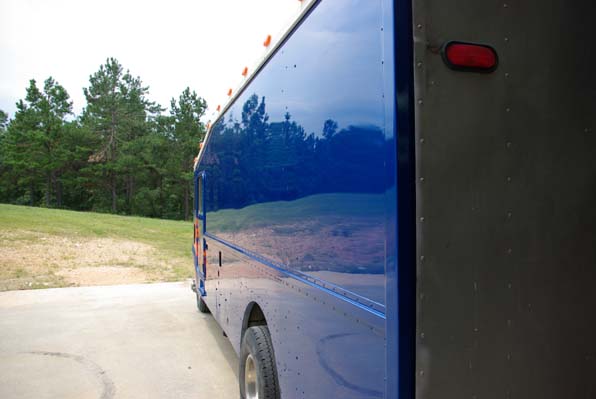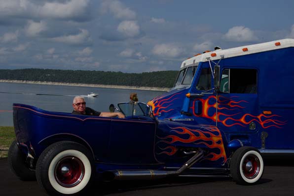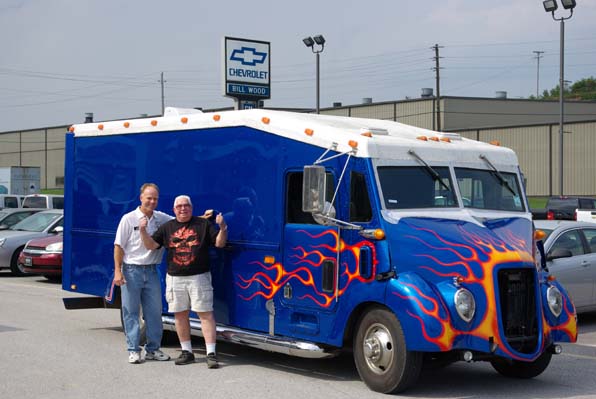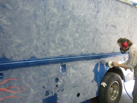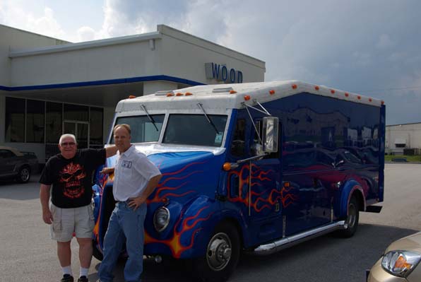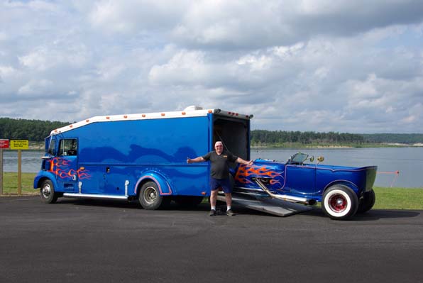 In time for the NSRA Springfield event the Monster was back on the road (temporary turn downs instead of the side exhaust). The first dive for Norm was with a full load. The hills between Lead Hill and Springfield were no problem for the new engine. Mileage improved too. Not a bad conclusion for an engine swap. During the event in Springfield Norm was so happy with the way the hauler now hauled that he had another idea. "Hey, you guys did a great job with the engine, do you think you could paint it?" Razorback Rides has a new booth but the Kookie Monster is more than just a little too big to fit. Two 100 rolls of masking film covered most of the things in their fab building while the Monster received a new paint job. Norm did not want to go overboard so he requested a basic flat black paint scheme. Razorback Rides said the difference in work between a flat black job and pearl blue with red and yellow flames was not great enough to justify the monochrome approach. Norm said keep it simple till the day he saw it painted. Norm was quick to say, " I knew blue with flames would look fantastic". Razorback Rides offered to spray a quick coat of flat black over the vehicle if that was really what Norm wanted. To be polite Norm said "No, thats OK."