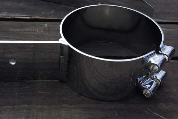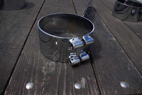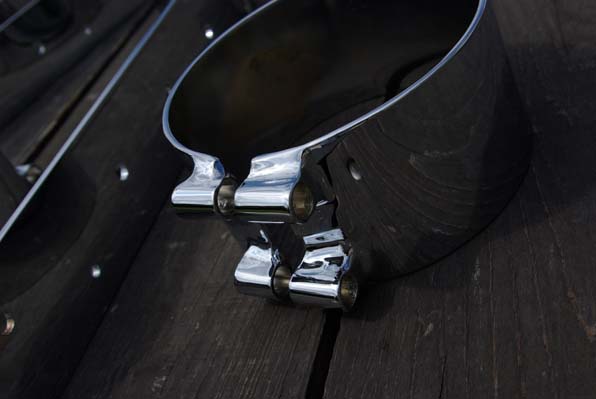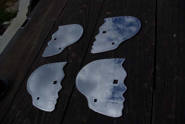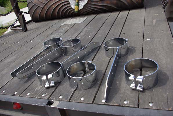 Several options were explored for hanging the pipes. Ultimately exposed hangers were chosen. Razorback Rides suggested that some type of decorative skull or a Norm head would look good at the top of the hangers. Norm agreed and told them," Sounds like a lot of work, make sure they all look the same." A nice shop, but they just dont know when to keep their mouths shut. After a many hours of cutting, welding and grinding, heads and hangers were ready. When Norm saw the results he knew exactly what to do. A quick phone call to Steve Tracy at Advanced Plating had the path ready for some really slick chrome. Everybody was very pleased with the end result. As Razorback Rides had planned, the pipes mounted in a very simple way once all the details had been fabricated.